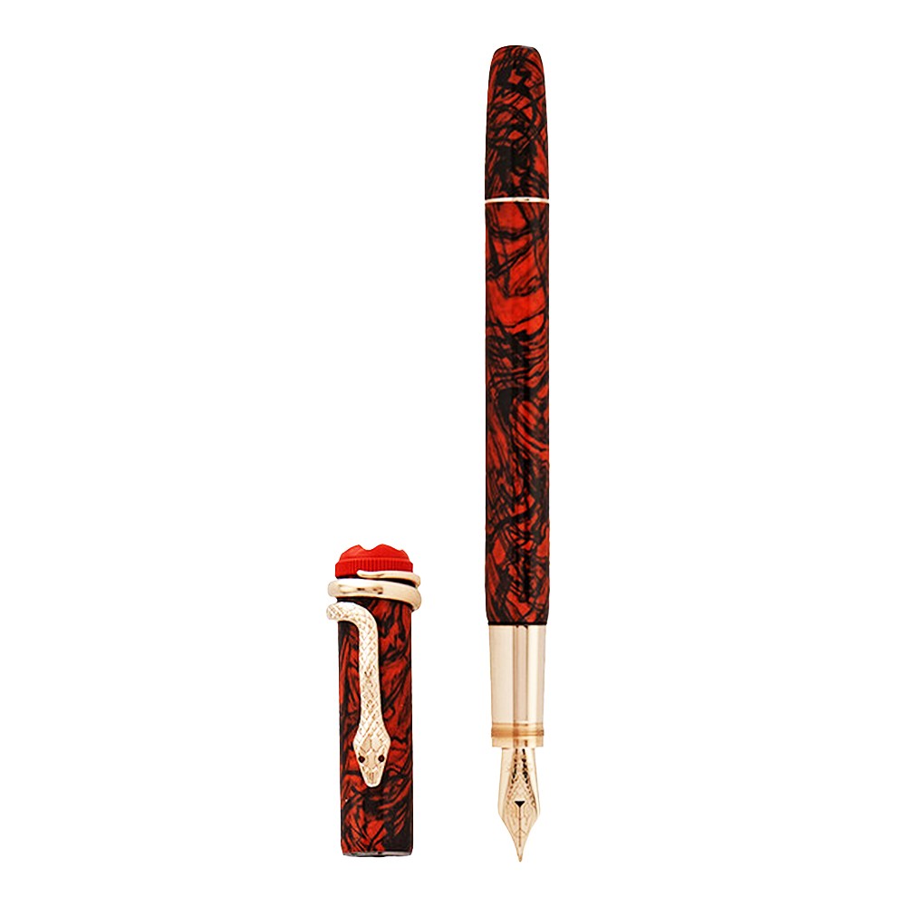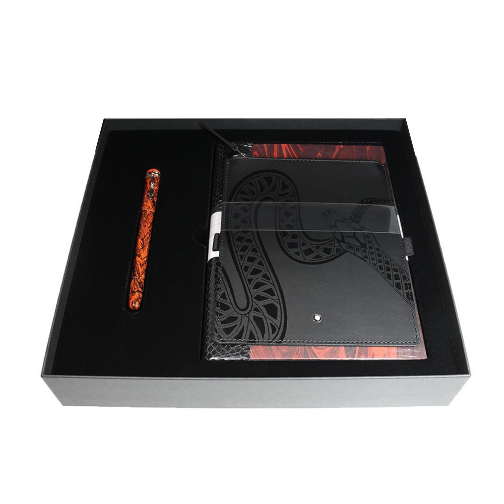 Montblanc's writing set celebrates the brand's pioneering spirit with the lacquered resin 'Rouge et Noir' fountain pen, which was first developed in 1906 and refined over the years. The rhodium-plated nib is engraved with a serpent head that matches the printed leather pouch and python-effect leather-trimmed notebook. The pen is based on the Serpent marble (MB119852) but with gold tone fittings.