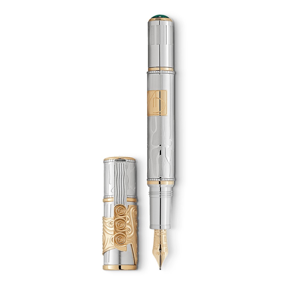 Great artists throughout history have expressed the human experience in a universal language of form and beauty. The Montblanc Masters of Art Collection honors their eternal contribution to the quest for perfection in art – a quest Montblanc both celebrates and participates in. One artist whose vision helped shape Viennese Art Nouveau and the Golden Age is Gustav Klimt. The Montblanc Masters of Art Homage to Gustav Klimt Limited Edition 888 celebrates his active commitment to the Vienna Secession and features design highlights from his Beethoven Frieze – the large scale masterpiece of his ‘Golden Phase’ that he created for the Secession building. The relief-like solid Au 750 yellow gold overlay on the platinum-coated cap, with its spirals and vertical lines symbolizing the strings of a lyre, is a reference to the golden ornamentation of the Beethoven Frieze as well as its lyre-playing figure of poetry, whose sounds are said to quench humanity's longing for happiness. Two-dimensional lines inspired by the facade reliefs of the Secession building shine against the matte background of the platinum-coated cap and barrel. The combination of solid Au 750 yellow gold and platinum-coated elements on the cap and barrel echo the experimental and luxurious materials typical of Gustav Klimt. The interplay is enriched by a malachite cabochon in the cone. The green color of malachite evokes spring, the season of new beginnings. In recognition of Klimt's achievements for the Vienna Secession, the solid Au 750 gold inlay on the barrel bears his Secession monogram with the initials GK. The clip of the Homage to Gustav Klimt Limited Edition 888 is specially designed with reference to Gustav Klimt’s Pallas Athene. Since Athena is the goddess of both war and the arts, she is depicted launching the struggle for artistic freedom. The slightly curved lines ending in three spirals on the partly platinum-coated, partly yellow gold-coated clip of the Limited Edition 888 correspond to the decoration on the forged metal frame. The handcrafted solid Au 750 yellow gold nib of the Homage to Gustav Klimt Limited Edition 888 is adorned with finely engraved graphic elements that form the typical geometric patterns seen in many of Gustav Klimt's works.