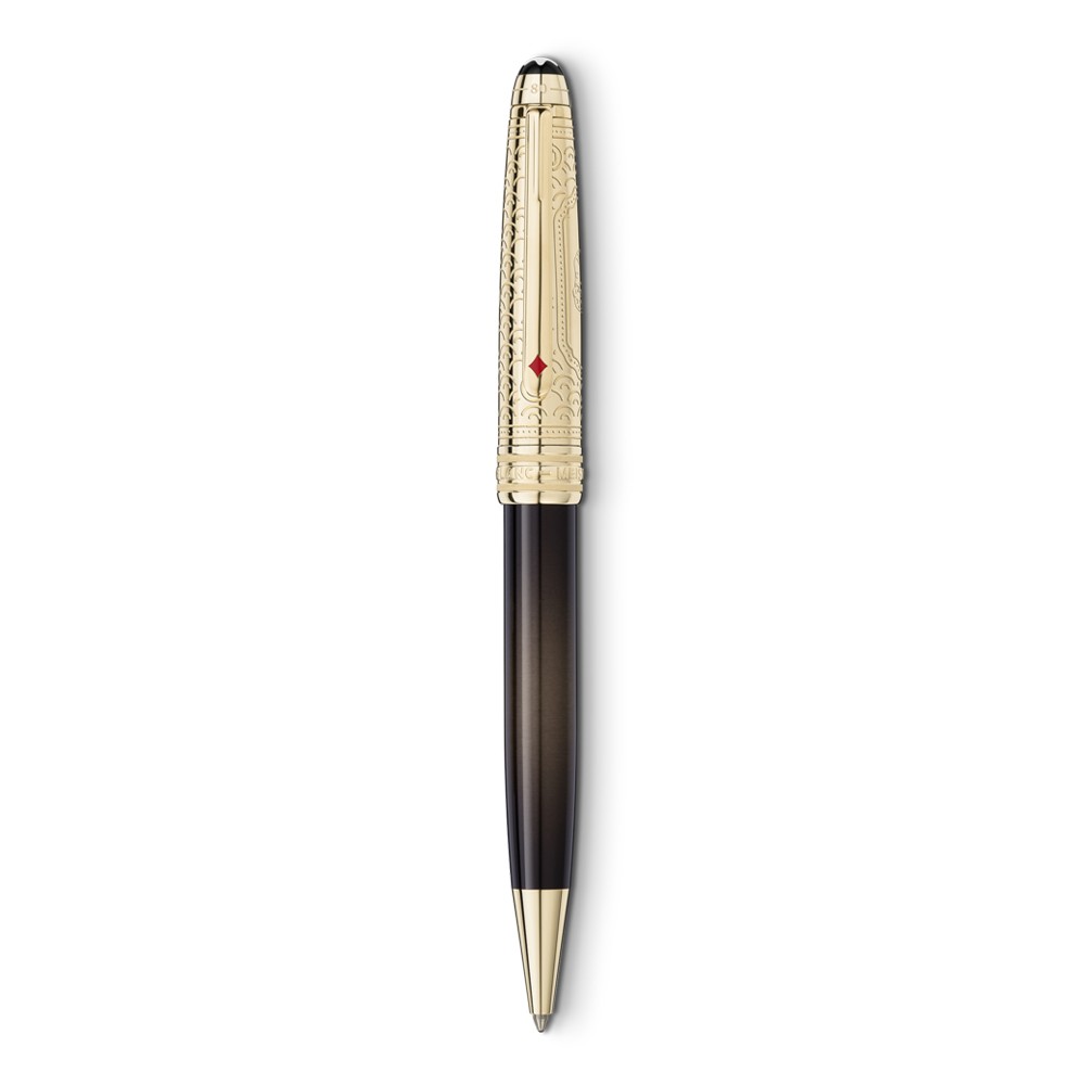 The Meisterstück Around the World in 80 Days collection is inspired by the famous adventure novel by Jules Verne. The Doué Classique Ballpoint Pen with a gold coated metal cap and degrade anthracite lacquered barrel, draws on the second leg of the journey from Bombay to Yokohama. The main characters travel in this part of the adventure on a majestic elephant, which is featured in a cartouche on the cap. The cap end is made of gold coated metal and features an engraved pattern that symbolizes good luck. The clip features a red lacquered diamond card suit and the cone is engraved with a pattern inspired by Princess Aouda's jewelry and the card suits, representing Mr. Fogg's wager to make the journey in 80 day. The cap top is embossed with the length of the journey, 25 days from Bombay to Yokohama and 80 days in total.