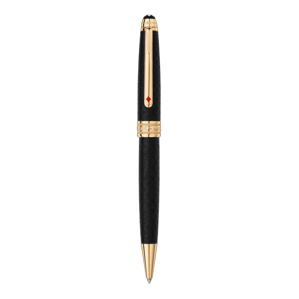 The Solitaire Midsize Ballpoint in black stained wood, draws on the second leg of the journey from Bombay to Yokohama. Wood is chosen to pay tribute to when Mr. Fogg saves Princess Aouda from being forced to commit suttee. The main characters travel in this part of the adventure on a majestic elephant, which is featured in a cartouche on the cap. The cap and the barrel feature an engraved pattern that symbolizes good luck. The clip features a red lacquered diamond card suit, representing Mr. Fogg's wager to make the journey in 80 days. The cap top is embossed with the length of the journey, 25 days from Bombay to Yokohama and 80 days in total.