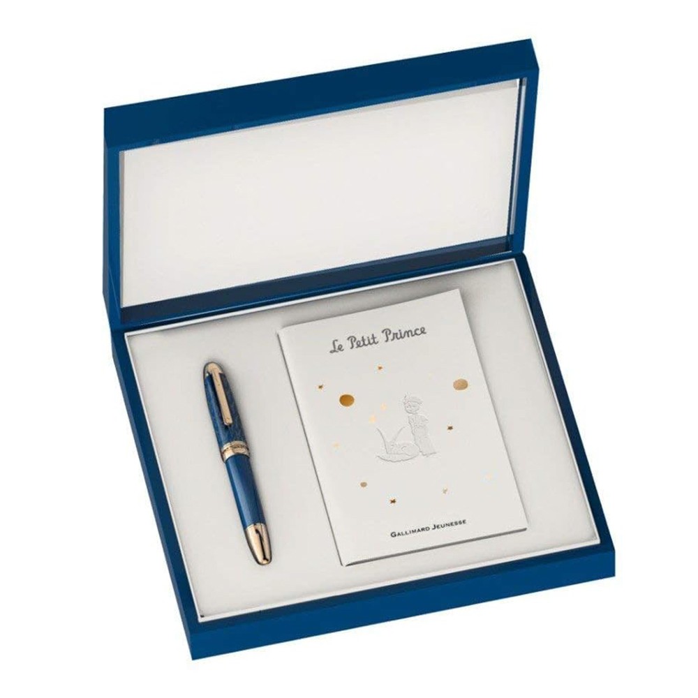 The Meisterstück Le Petit Prince & Fox collection honors the beloved tale by Antoine de Staint-Exupéry. The Happy Holiday set features a LeGrand fountain pen with champagne tone trim and an exclusive universal edition of Le Petit Prince. The pen is crafted from deep-blue precious-resin inspired by the dark-blue universe sky. Its cap is milled with a fox face pattern and features a clip embellished by a yellow-lacquered star. Metal details are coated in champagne-tone gold. Piston mechanism with ink window. Medium nib is 18k gold with a bicolor engraving of the Petit Prince and fox. The finishing touch is the iconic Montblanc snowcap finial with a quotation from the novella. Pen based on MB118052 (silver tone trim).